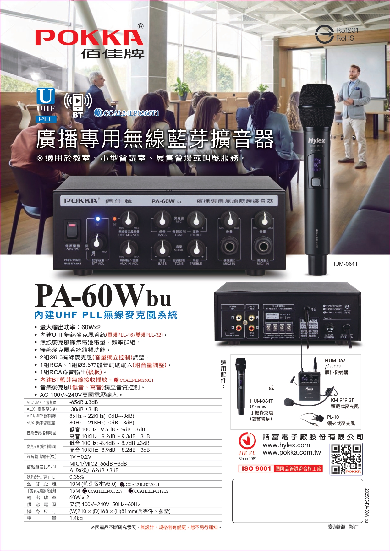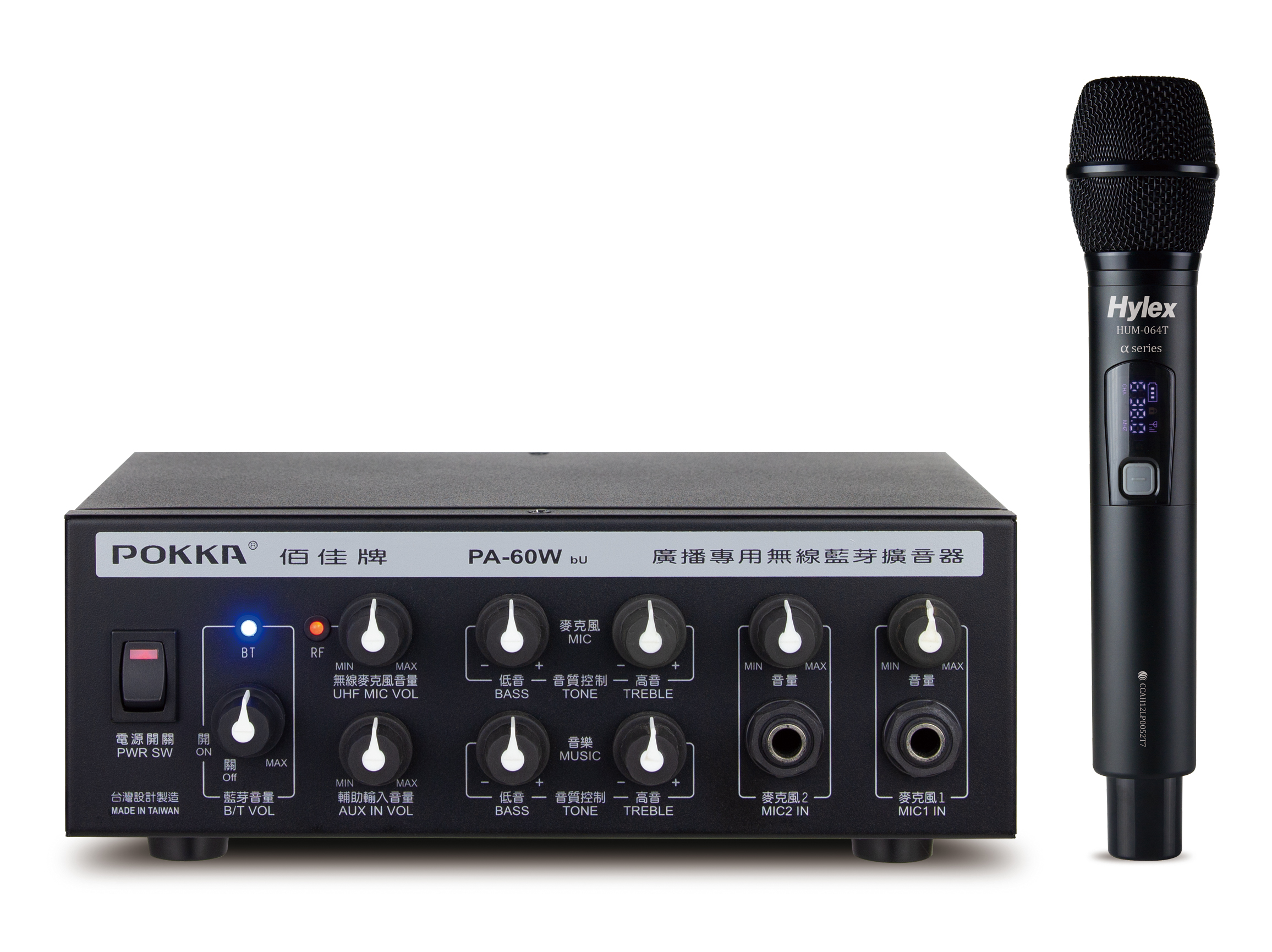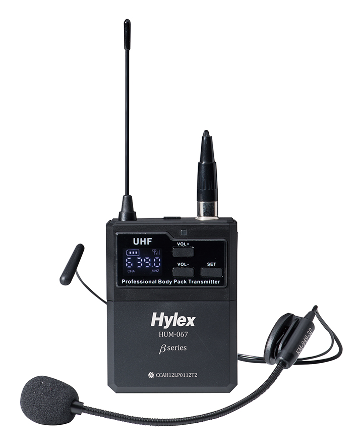 - 選用配件:腰掛發射器HUM-067 、手握麥克風HUM-064T鋁管、頭戴麥克風KM-949-3P、領夾式麥克風PL-10
