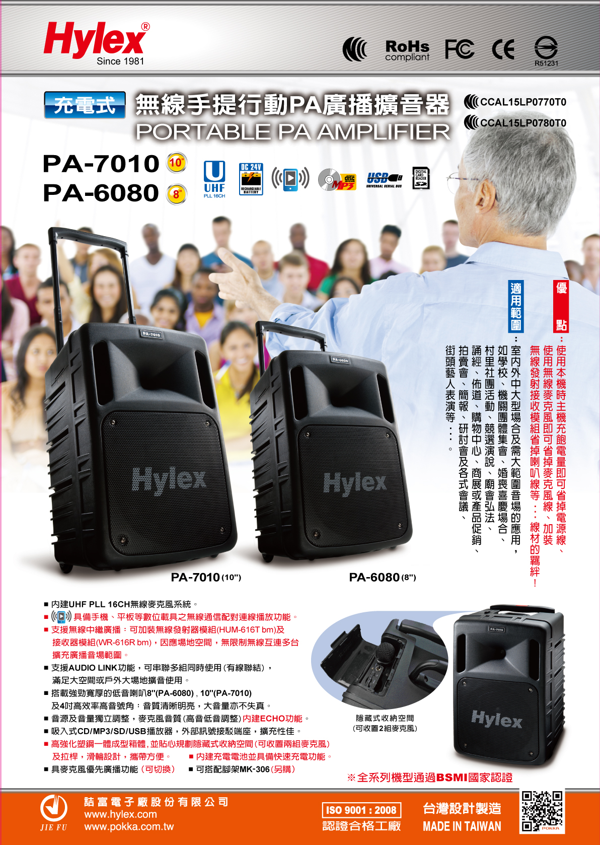 PA-7010DPLb/2CH Hylex 300W UHF手提式PA廣播系統 / 雙頻道 / UHF PLL 200頻道選擇 / 最大輸出功率300W/BT,ECHO,USB,SD / 充電式 適用:宗教集會,工廠,學校,機關團體,室內外活動,村里,小型會議 / 一年保固 / 台灣製造