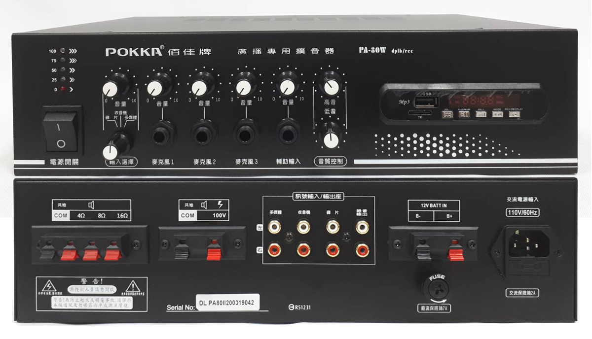 ✩✩PA-80WDPLBREC POKKA 綜合擴大機DPLbREC版 最大輸出功率80W/附數位播放器(USB/TF/藍芽)