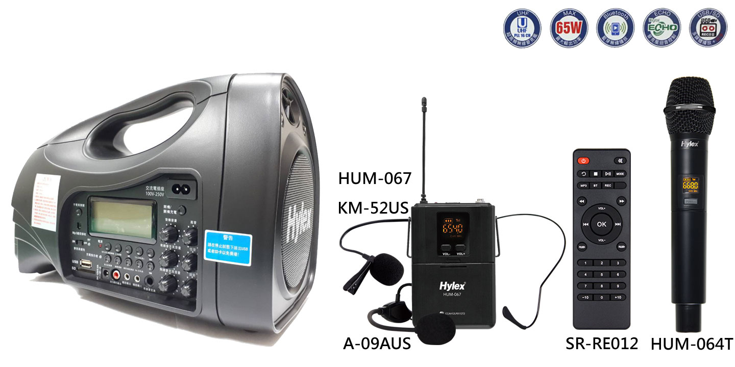 - 內建UHF 無線接收系統,50M超長距離接收 & 1組6.3Ø 有線麥克風輸入端座,一組音樂音量調整鈕及有線/無線麥克風獨立音量調整。